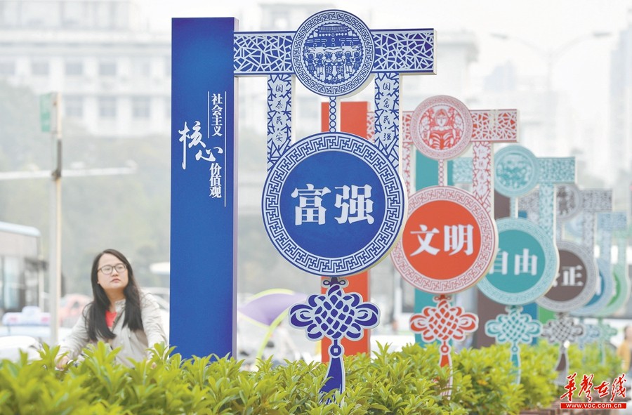 10月29日,长沙市岳麓区咸嘉湖街道公益广告提质示范点,市民从核心价值观主题景观边经过。本月中下旬,长沙市文明办组织开展公益广告提质示范点建设推广工作,快速推动城区主要示范点的公益广告提质提档,并进行了验收。