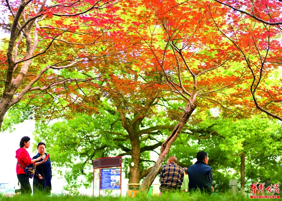 10月23日,湖南烈士公园,游客在红黄绿相织的树叶下游玩。当天是农历二十四节气中的霜降,是秋季到冬季的一个过渡时期。自霜降始,白昼秋云散漫远,霜月萧萧霜飞寒,冬日渐近。 记者 唐俊 摄