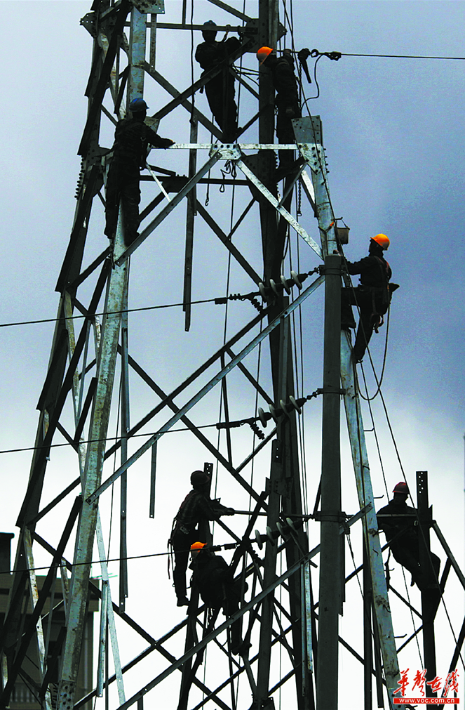10月16日,施工人员冒雨组立龙山县落水洞电站上网线路铁塔。该电站2014年9月动工,投资3.93亿元,安装发电机组3.5万千瓦,计划年底建成。