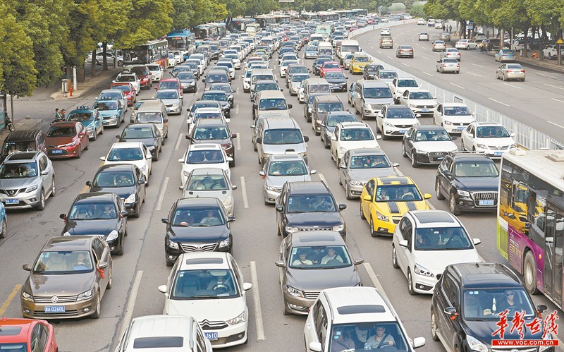 10月8日下午3时许,长沙市开福区三一大道由东往西方向,车辆排起了长队。当天是国庆、中秋假期最后一天,外出探亲、访友和旅游的人们纷纷返程,城区不少道路出现了车辆拥堵现象。 湖南日报记者 李健 摄