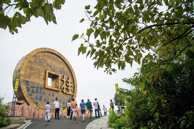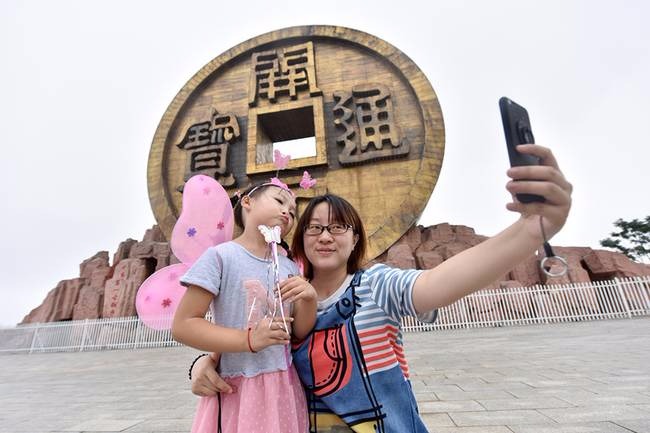 国庆期间,游客在湖南桂阳县宝山国家矿山公园观赏世界最大的“铜钱币”雕塑,10月3日当天,公园迎来今年首个黄金旅游高峰期。