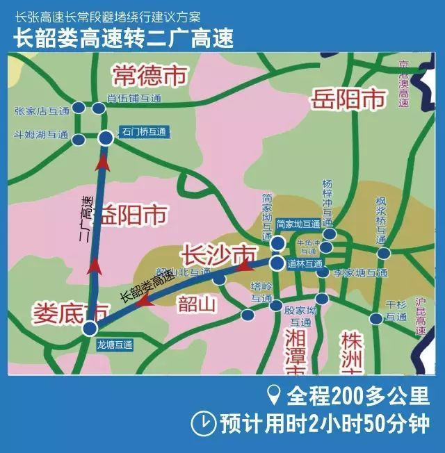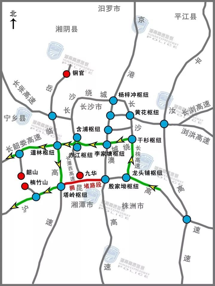 从G60沪昆高速龙头铺互通往北转S21长株高速,经干杉互通转G0401长沙绕城高速东南段和西南段,也可选择往北经S21长株高速的黄花互通转G0401长沙绕城高速东北段和西北段。再经长潭西高速、长韶娄、S61岳临高速再转G60沪昆高速或前往贵州、云南等省,省内前往怀化、邵阳、娄底等市州的车辆可直接选择与沪昆高速平行的长韶娄-娄怀高速通行。沪昆高速和长韶娄高速是互为分流路段,请驾驶员及时关注路况信息,合理规划出行线路。线路如图示: