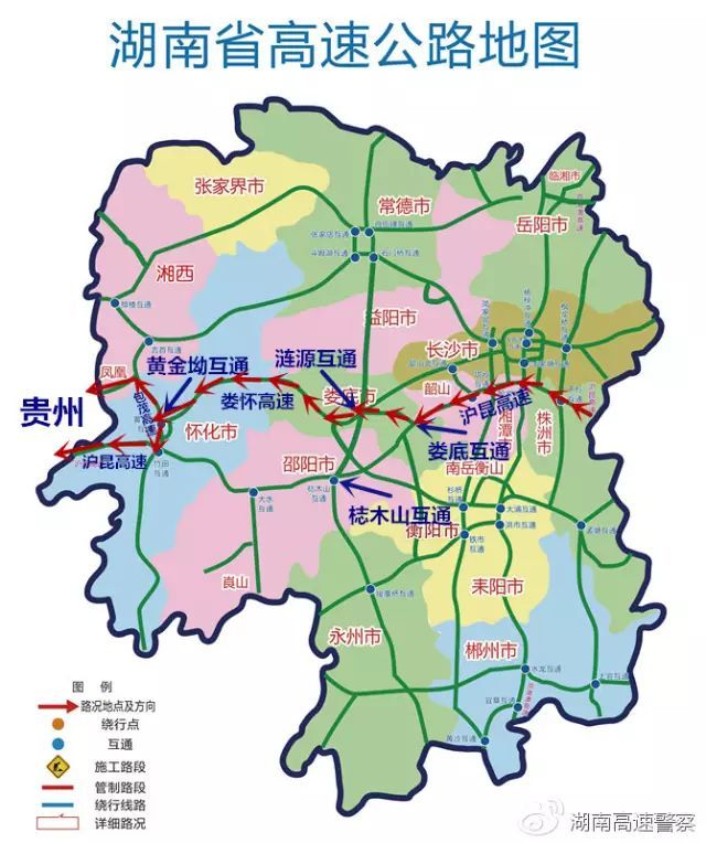 避堵线路一:G60沪昆高速 - 娄底互通 - 涟源互通 - S70娄怀高速 - 黄金坳互通 - G65包茂高速,可至怀化、贵州(铜仁、玉屏)