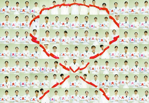 11月29日,衡阳市南华大学护理学院的志愿者手举防艾宣传标语(拼图)。第30个“世界艾滋病日”前夕,该院志愿者手上套着红丝带做出各种形式的拥抱动作,通过朋友圈宣传防“艾”,呼吁全社会关注艾滋病,携手抗“艾”。