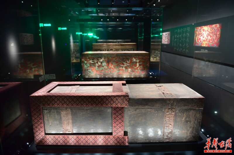 在新馆三楼的“长沙马王堆汉墓陈列”,走至一个空旷的地方,中间一个“坑”引起了众人的注意。突然间,流动繁复的神怪图案,在坑内四周闪动,配以庄重肃穆的音乐,整个“气场”让在场的观众无不震撼。现场的工作人员介绍,这是新馆首次以1:1的比例复原了辛追墓。近17米深的“墓坑”从三楼一直深入底层,四周“墓壁”上还动态呈现辛追的黑漆素棺、黑地彩绘漆棺、朱地彩绘漆棺、锦饰漆棺等四层棺木“如何一层层套上去”。