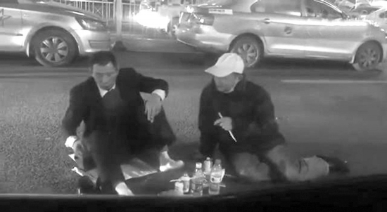11月22日凌晨,解放西路,两位大叔坐在路中间喝酒、撸串。视频截图