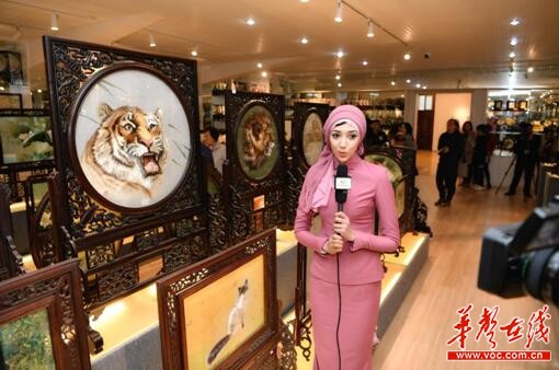 华声在线11月15日讯(通讯员 米苏)“现在我手边的是一幅非常珍贵的湘绣作品,我们可以看出,它的刺绣技艺是如此的高超与精湛,光眼睛部位,就有20多个色阶。”11月14日下午,在湖南省湘绣研究所展厅内,面对栩栩如生的双面绣作品《虎头》,来自迪拜《中阿卫视》的美女记者馨玥面对镜头,用一口流利的中文娓娓道来。