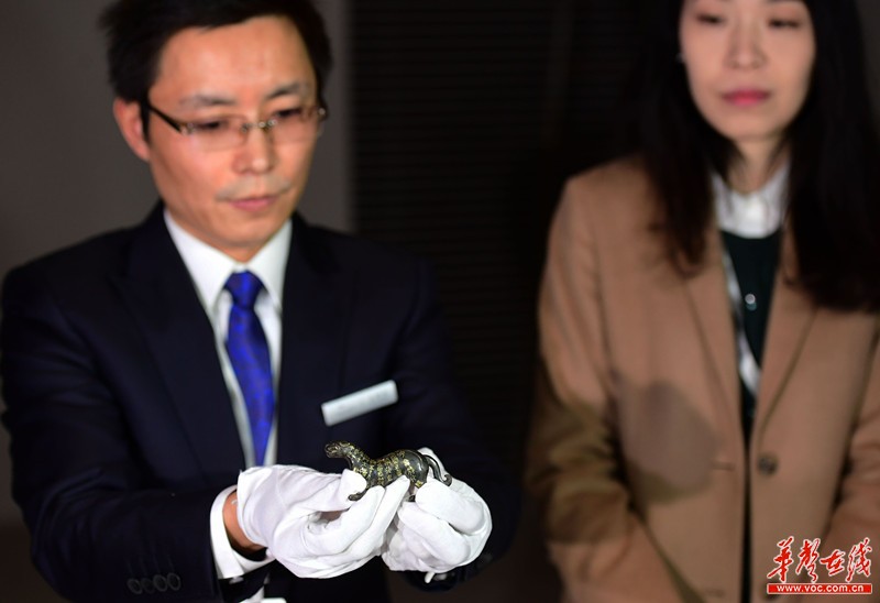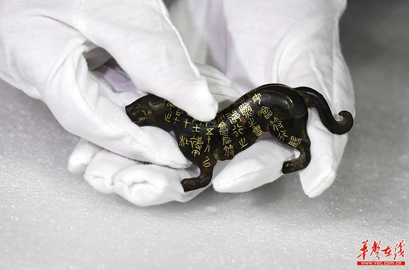 “敌方大军压境,战事急,亟待将军调遣兵力前来增援.......”这是古装影视剧中常出现的情景。在此次展览中,入选央视《国家宝藏》栏目的国宝级文物——“秦杜虎符”将带领大家穿越时空感受两千多年前战场上的烽火狼烟。在重点文物开箱现场,记者看到,青铜质地的杜虎兵符,模仿虎的形态,背面有槽,颈上有一小孔,虎符上有错金铭文9行,40字。省博物馆副研究员王树金介绍,这件收藏于陕西历史博物馆的虎符只有左半符,所以被称为“秦杜虎符”,而右半符的去向至今为谜。秦杜虎符最珍贵的地方在于铸在它身上的铭文,是所有出土虎符中铭文最长的一件,且保存完好,特别是40个错金字,做工精致,笔画优美,反映了中国古代错金工艺的高超水平。