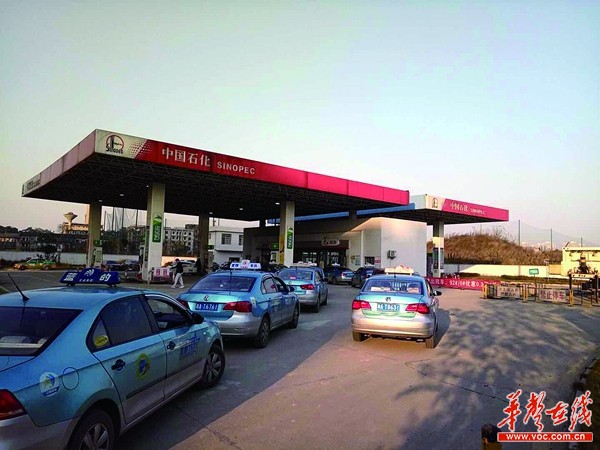12月20日,在滨江路中石化加油站挂牌优惠点,前来加油的出租车排起了队。在记者采访的20分钟内,约20辆车加油。 见习记者 陈柯妤 摄
