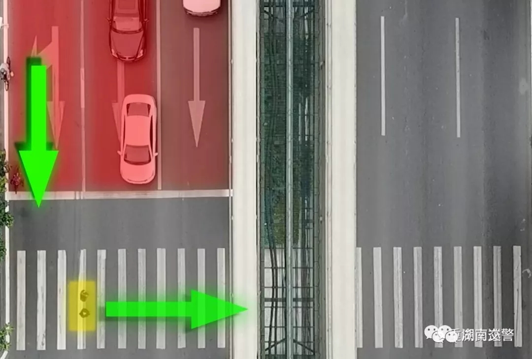 通俗点来说,就是不论行人行走的方向,不管行人在第几个车道,不论车行道是双向四车道还是双向六车道,只要是行人行走方向前方相邻的两个车道,机动车就必须停车让行。