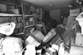 ▶12月9日,长沙市岳麓区银鑫家园B区5栋,车库里囤积的快递乱叠放在一起。图/记者金林