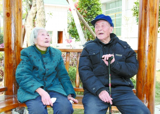 2014年4月,陈本初(右)在县烈士陵园祭扫苏杰烈士墓后和老伴在长廊上休息。