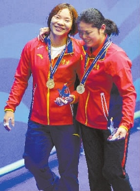 今年8月30日,向艳梅夺得第十三届全运会女子举重69公斤级冠军。领完奖牌后,周继红(右)和向艳梅欢笑离场。湖南日报记者 唐俊 摄