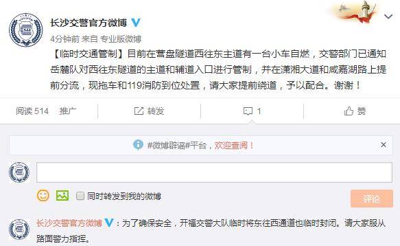据长沙交警官方微博通报,营盘路隧道西往东道有一台小车自燃,交通部门已通知岳麓队对西往东的主道和辅道路口进行管制,并在潇湘大道和咸嘉湖路上提前分分流,开福区交警大队也将东往西通道临时封闭,请大家提前绕道。