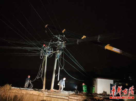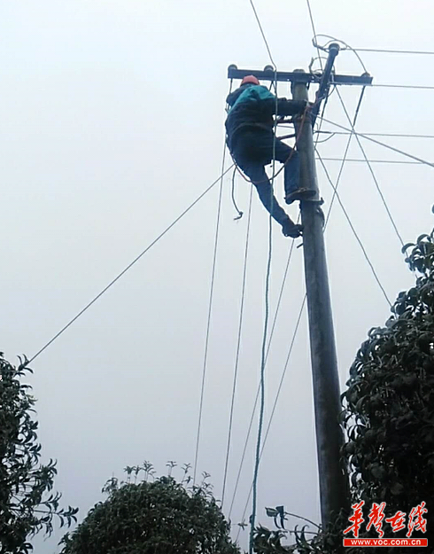1月27日下午,黄花镇华湘村竹马塘台区1号杆因线路覆冰承载力过重,出现故障。国网长沙县供电公司黄花供电所“电雷锋”共产党员服务队迅速组织抢修,至20点20分,抢修工作进入尾声。