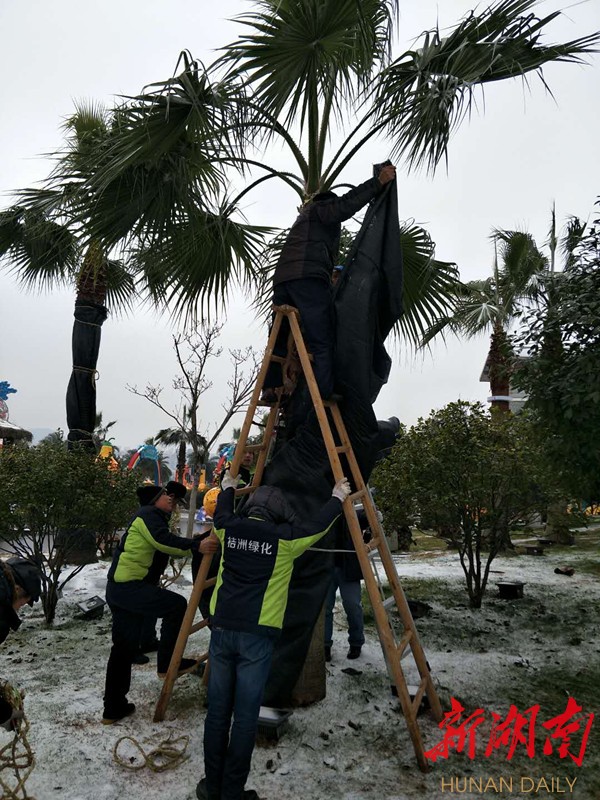 今天,按照应急工作预案要求,景区管理处组织工作人员对南、北支桥口进行封闭,张贴闭园通知;抗冰除雪工作迅速开展,组织120余人对南支桥、景区主干道进行积雪清除,做好道路撒盐除冰;加大设施、设备巡查力度,进一步做好热带植物的防寒防冻工作。