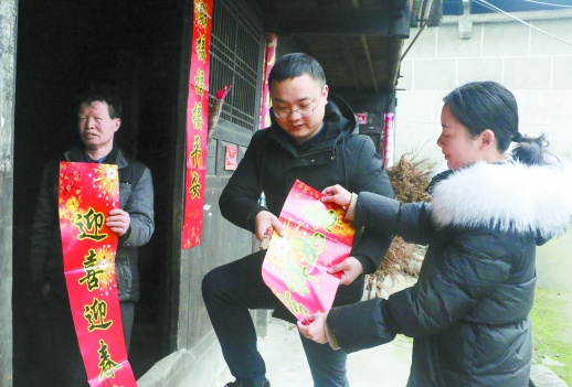 1月24日,怀化市洪江区桂花园乡优胜村大塘口组,工作人员为贫困户向元贵家贴春联和窗花。最近,该乡组织党员干部走进1143户贫困户家中,开展“送春联,送祝福,送平安”活动,为贫困户送去挂历、对联、窗花等物资。刘文颖 杨欢 摄影报道