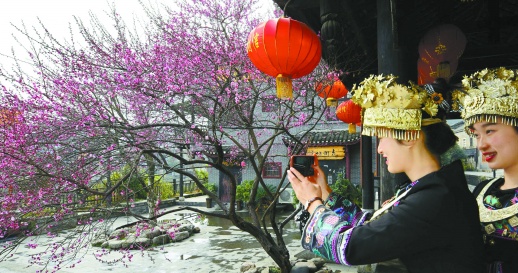 1月21日,吉首市乾州古城三门开梅廊,苗家姑娘观赏梅花,拍照留影。寒冬时节,绽放的梅花与古城交相辉映,独具风情,让人赞叹不已。 姚方 摄