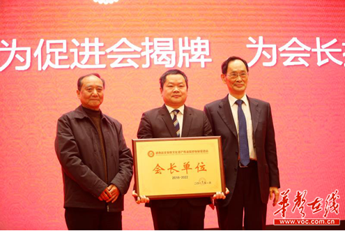 文化部原副部长潘震宙与湖南省国土资源厅原厅长张以坤为会长阳绯文授牌