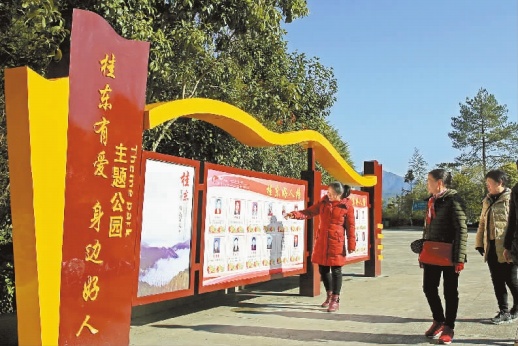 1月10日,桂东县三台山森林公园,市民在阅读“好人榜”上的好人事迹。最近,该县通过建设好人事迹展示长廊和主题广场,将该公园打造成好人文化主题公园,传播正能量。邓仁湘 摄