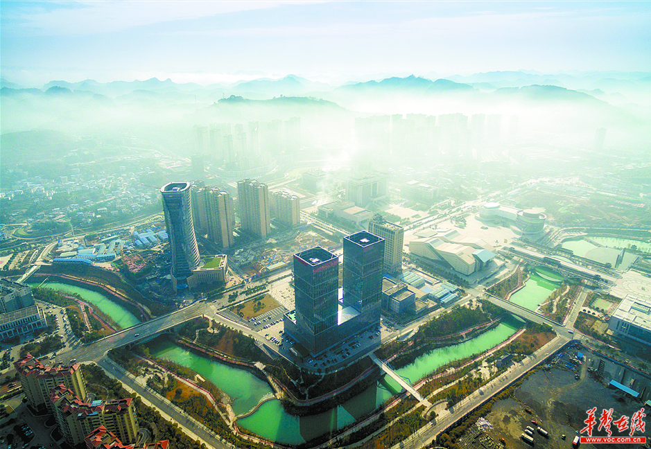 1月10日,湘西经济开发区出现平流雾,近年新崛起的一幢幢高楼在云雾中若隐若现。
