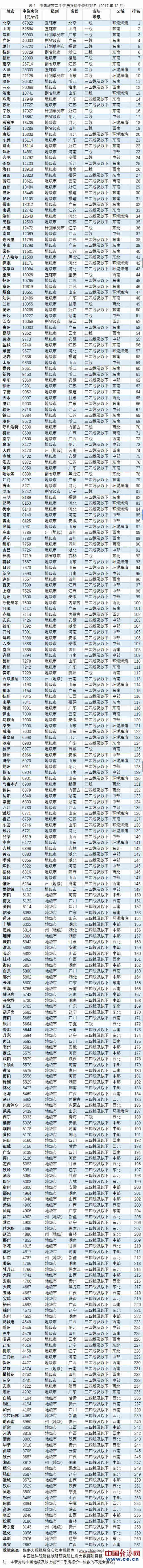 据介绍,该项分析以来自互联网的430万条二手住房报价为基础,对2017年12月中国地级及以上城市二手住房报价中位数作了不完全样本排名。