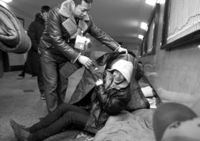 1月8日,长沙五一路太平街地下通道,民政人员正给流浪者披上送去的棉衣。图/记者杨旭