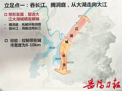 在自上而下、高屋建瓴的发展战略共识下,2017年年初,岳阳市委经济工作会议明确,围绕打造200万人以上大城市圈目的,积极拓展城市发展空间,加快推进以中心城区为核心圈,以经开区、南湖新区、云溪区、君山区位内圈,以临湘市、岳阳县为外圈的“1+4+2”城市组团,实现规划无缝对接、产业错位发展、交通快速便捷、管理高度融合,把岳阳建成长株潭城市群和武汉城市圈间的区域中心城市。
