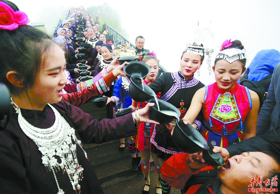 图②:1月1日,200多名身着民族服饰的侗族村民用侗族“高山流水”的礼节迎接前来观光的游客。当天,通道侗族自治县万佛山景区举行“2018年万佛山挑战‘世界第一高山流水’”活动。