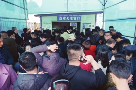 2月26日,长沙市交警支队车辆管理所城南分所,交通违法处理窗口前挤满了人。图/记者杨旭
