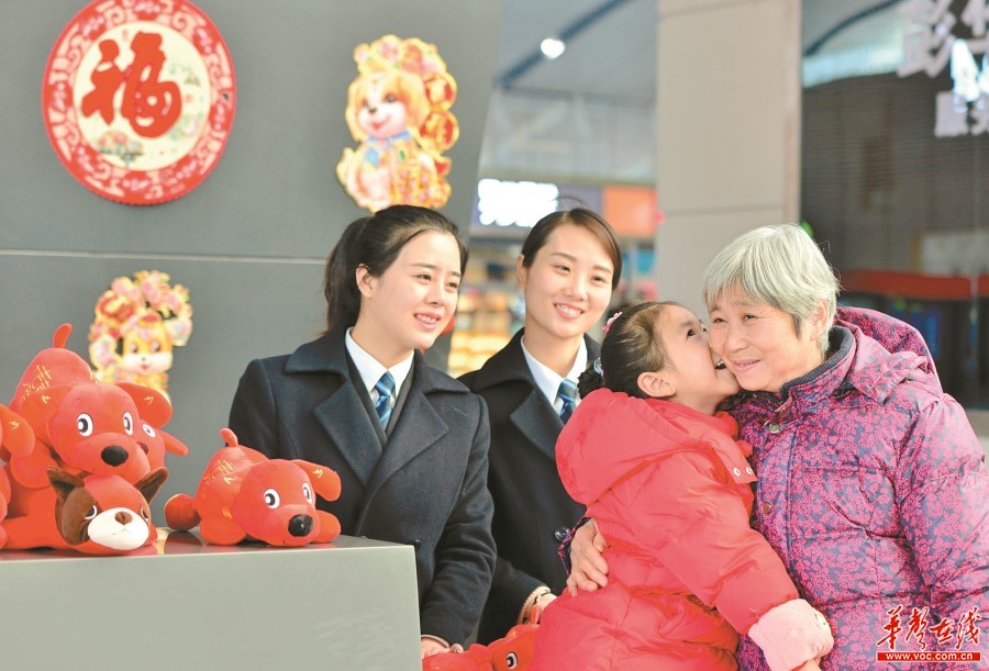 2月5日,长沙南站,一名小朋友亲密地对奶奶说“我爱你”。春运启动后,长沙南站开展“春运路上,让爱发声”活动,鼓励旅客表达心中的爱情、亲情、师生情等,车站为参与活动的旅客赠送春联和“福”字,温暖旅客回家路。