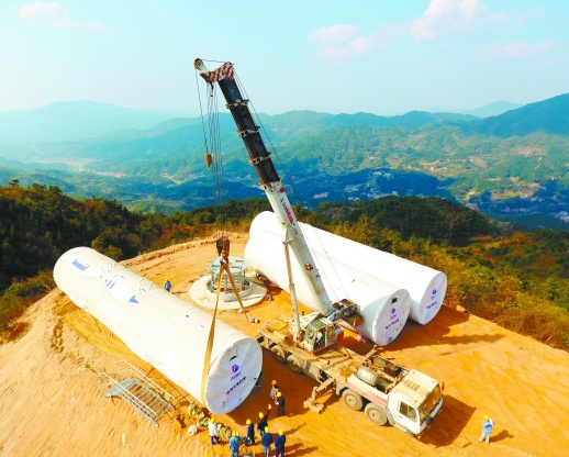 3月27日,双峰县紫云山,吊车在装卸风电塔筒。经过连日来的准备,双峰县紫云山风电场建设进入设备安装阶段。该风电项目计划投资4.5亿元,总装机容量为50MW,设计年发电量为9439万千瓦时。 李建新 摄