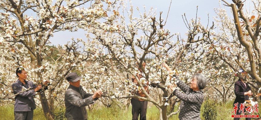 3月26日,洪江市岔头乡繁溪村金秋梨园,果农在实施疏花作业。近年来,该市积极发展金秋梨产业,金秋梨种植面积达30000余亩。目前,正值金秋梨花序分离期,针对金秋梨成花量大、坐果率高、花期养分消耗过大等特点,果农及时疏花,加强花期管理。 杨锡建 李林 摄影报道