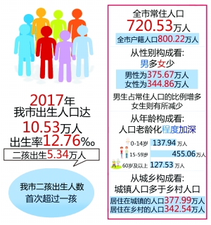最新人口统计数据表明:2017年全市二孩出生逾5.3万人,占出生人口50.7%