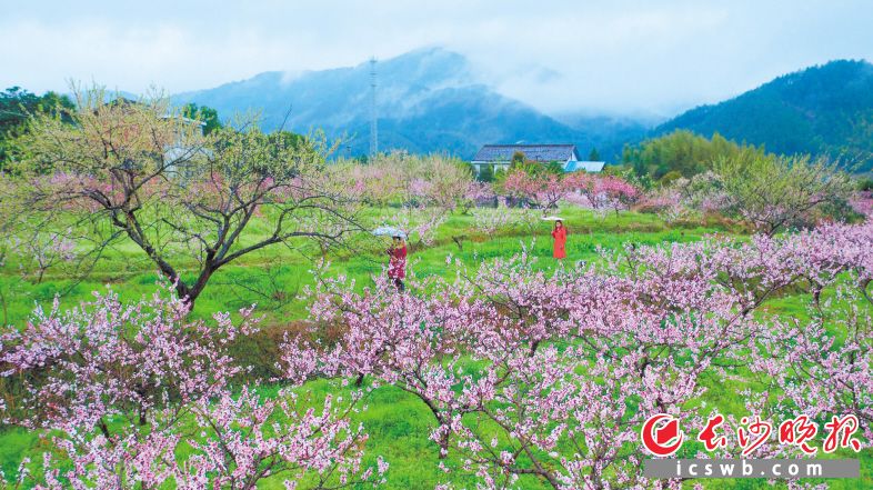 3月20日下午,浏阳市大围山镇楚东村上万亩桃花争相绽放,吸引了不少游客前往赏花。