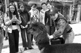 “哇,羊驼,好可爱啊!”12日中午,麓山南路大学城附近,一家眼镜店外的羊驼吸引了不少过往市民的注意,大家纷纷驻足观看并拿出手机拍照,一些女生还上前抚摸。经询问了解,此羊驼是眼镜店老板李先生所有,“去年2月份买的,最近才把它牵出来”。