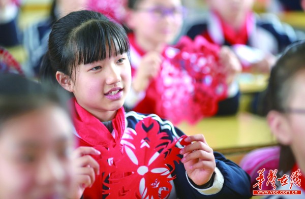 3月1日,衡南县明德小学,孩子们展示寒假期间的手工作业——剪窗花。当天,该校以猜灯谜、贴春联、剪窗花、挂灯笼、讲故事等多种形式举行开学第一课。刘晓飞 阳新 摄影报道