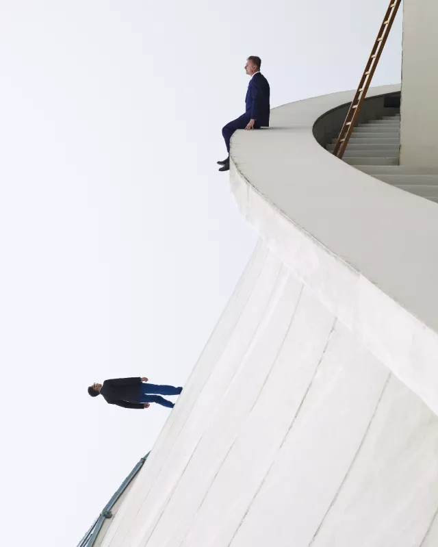 他的摄影作品似乎在跟空间玩游戏,总是或走或趟或立在与海平面垂直城90°的另一个平面上。入镜的都是他本人,永远穿得西装革履,再不济也是穿着白衬衫。