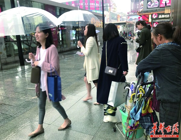 4月25日18时左右,本已放晴的天气又开始下起雨来,不少没带伞的上班族行色匆匆。在五一广场卖伞的陈阿姨,一面拉着小车,一面向路人兜售,“这几天不时下雨,生意不错。”