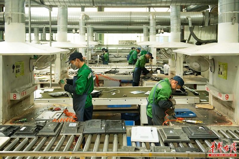 4月18日,宁乡经济技术开发区湖南绿色再生资源有限公司,工人们在拆解回收电子废弃物。该公司平均每天能拆解回收6000台(套)电子废弃物,资源回收率达80%,年产值超过2亿元。经过专业拆解回收的材料在家电产品生产过程中可再生循环利用,促进家电业实现绿色发展。