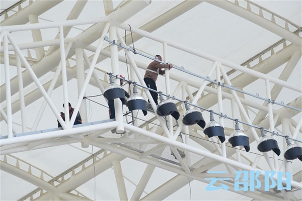 体育场装修进入扫尾工作,正在安装灯光。下一步将铺设人工草坪、塑胶跑道,并安装座椅。