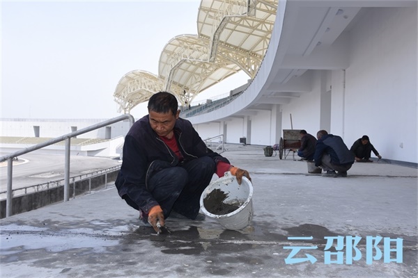 体育场内,施工人员正在做扫尾工作