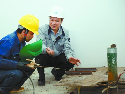 梁跃辉(右)在指导工人进行电焊操作。(资料图片) 通讯员 摄