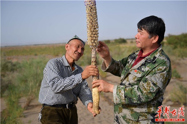 除了种植梭梭树,援疆队还帮助村民在树旁栽种了中药材肉苁蓉。全村99户困难户,每户分了5亩地,以每亩每年收入3000元计算,林下种植一项,每年可给村民增加1.5万元的收入。