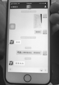 缪老师说,4月29日下午,他突然接到教务老师的反映,“说我班上一名男生拿着她的手机给妈妈发了微信。”看到发的微信内容,缪老师笑出了声,“××上课积极发言,表现很好”,约两个小时后,对方家长还回复了几个笑脸和抱拳的表情。