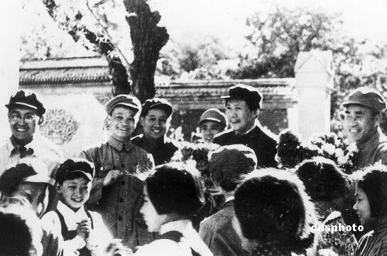 毛泽东(后排右二)和朱德(后排右一)、廖承志(后排左三)在一起。