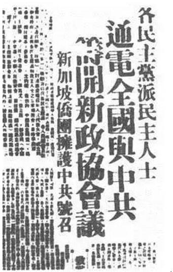 (五)各民主党派、各人民团体、各社会贤达迅速召开政治协商会议,讨论并实现召集人民代表大会,成立民主联合政府!