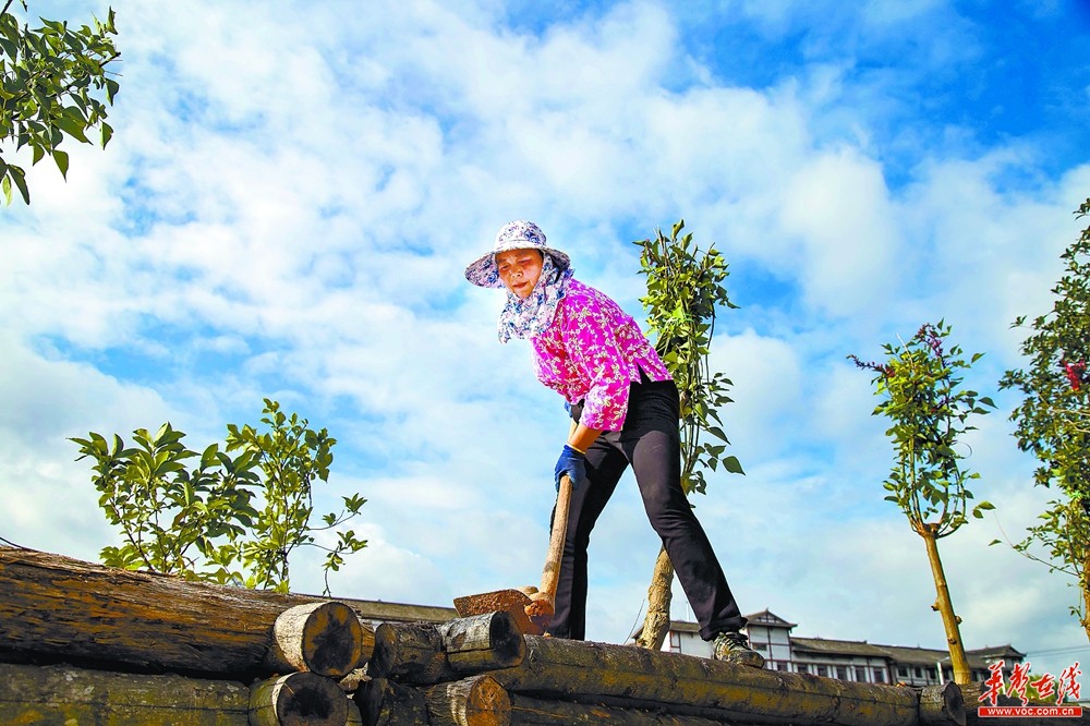 6月28日,通道侗族自治县双江镇,园林工人在烈日下种植树苗。近年来,该县加强城镇绿化、道路硬化、街道整治等基础项目建设,呈现了一个青山碧水蓝天的大美通道。