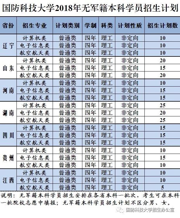 今日,记者从国防科技大学招生办公室获悉,经中央军委和教育部批准,国防科技大学2018年在辽宁、山东、河南、湖南、四川、贵州和江西等7省份面向普通高中毕业生招收无军籍本科学员。