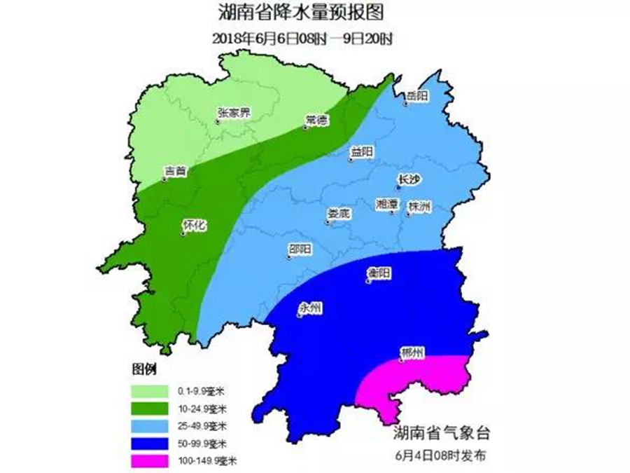 6~9日:湘南、湘西南有中等阵雨或雷阵雨,其中郴州、永州、衡阳、株洲南部、邵阳南部及怀化南部局地暴雨;
